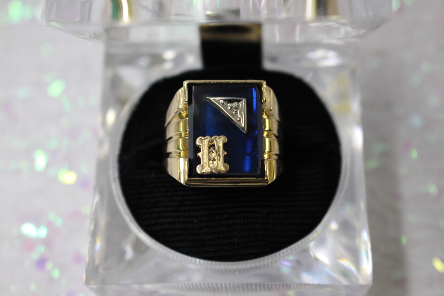 Elegant and unique! This Gold Ring features a bold large square blue stone with an engraved “H”, accented by a small corner diamond for an extra touch of sparkle. Comes with a professional appraisal for verified details and value.